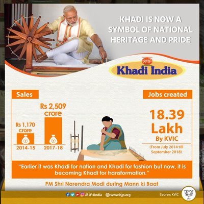 PM Modi's consistent appeal to adopt Khadi has struck a chord with the people, resulting in steep rise in the sale and use of khadi. The sales of khadi has more than doubled since 2014-15 & around 18.39 lakh jobs have been created through KVIC.